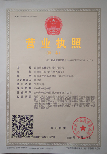 昆山鼎盛化学材料有限公司为一家批发零售:化学试剂、玻璃仪器、实验仪器及器材、进口试剂、标準溶液;化工原料等產品及实验室工程的综合性公司。公司位於昆山前进东路1008-140号(黎明清境商业街),经营范围如下: 1、化学试剂:CP、AR、GR级及基準试剂;IND;进口光谱纯(SP)、生化试剂, 环境分析產品,种类齐全; 2、玻璃仪器及实验仪器设备:国内知名品牌申玻,北玻,蜀玻等厂家供货